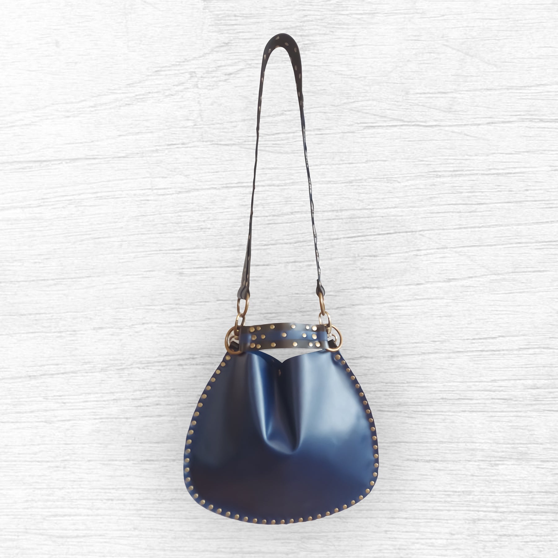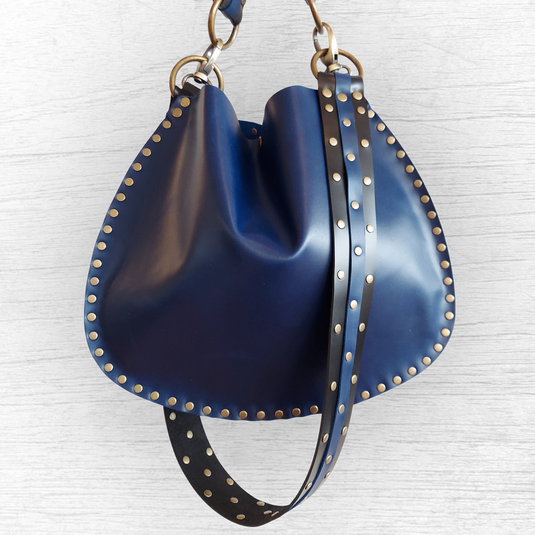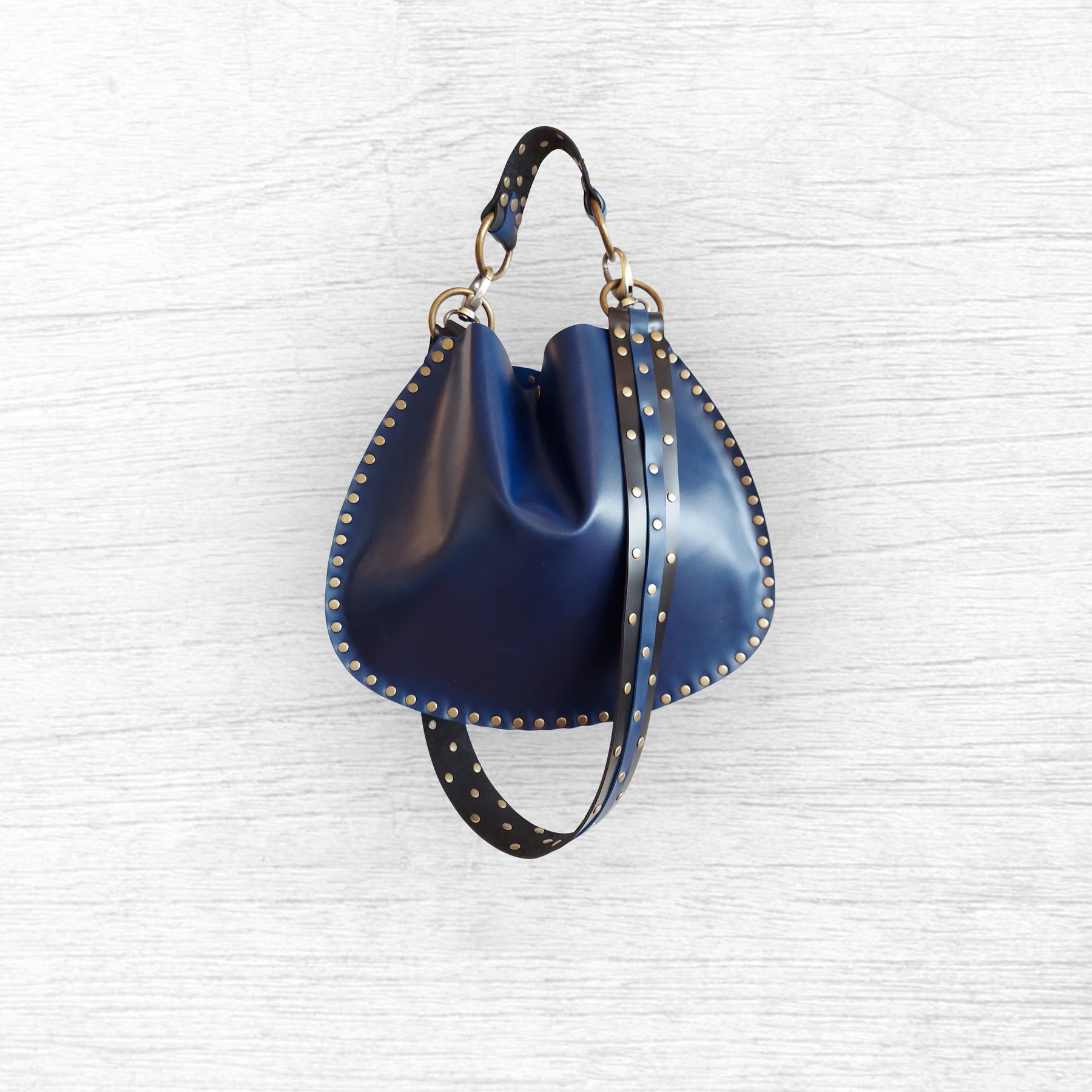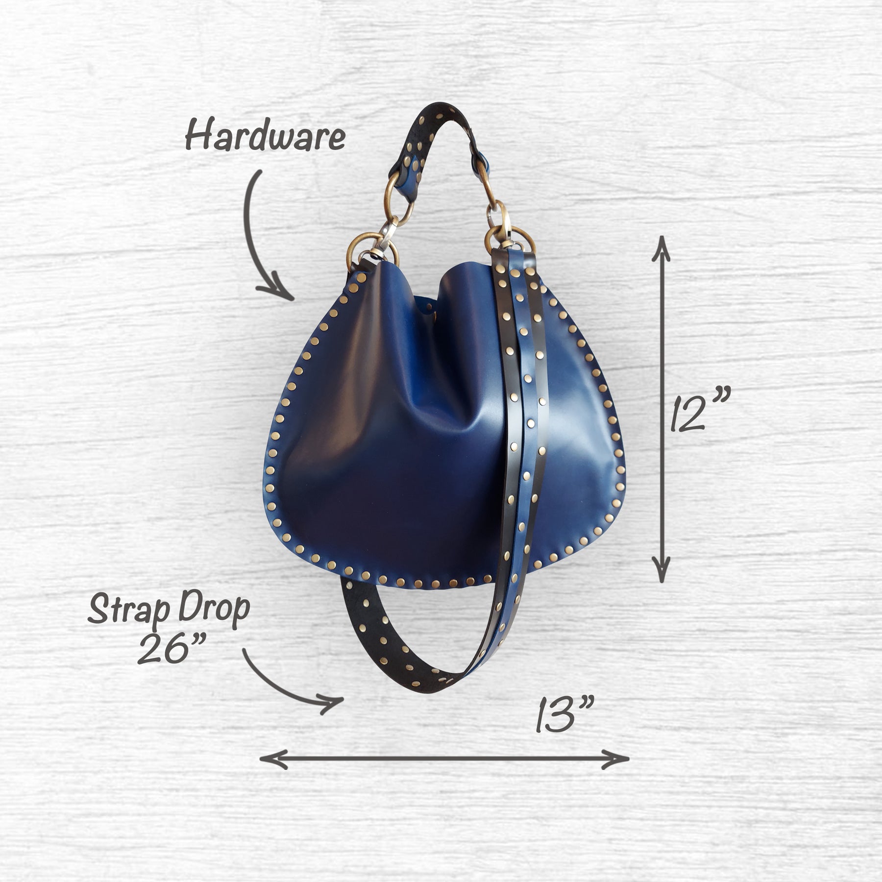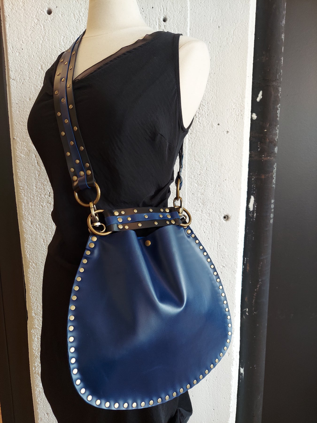 This Medium Crossbody comes in blue leather with signature studded trio straps. The perfect bag all year round. Straps are detachable and can be worn on other Rebellion Medium X-Body Bags for a Bag Makeover!