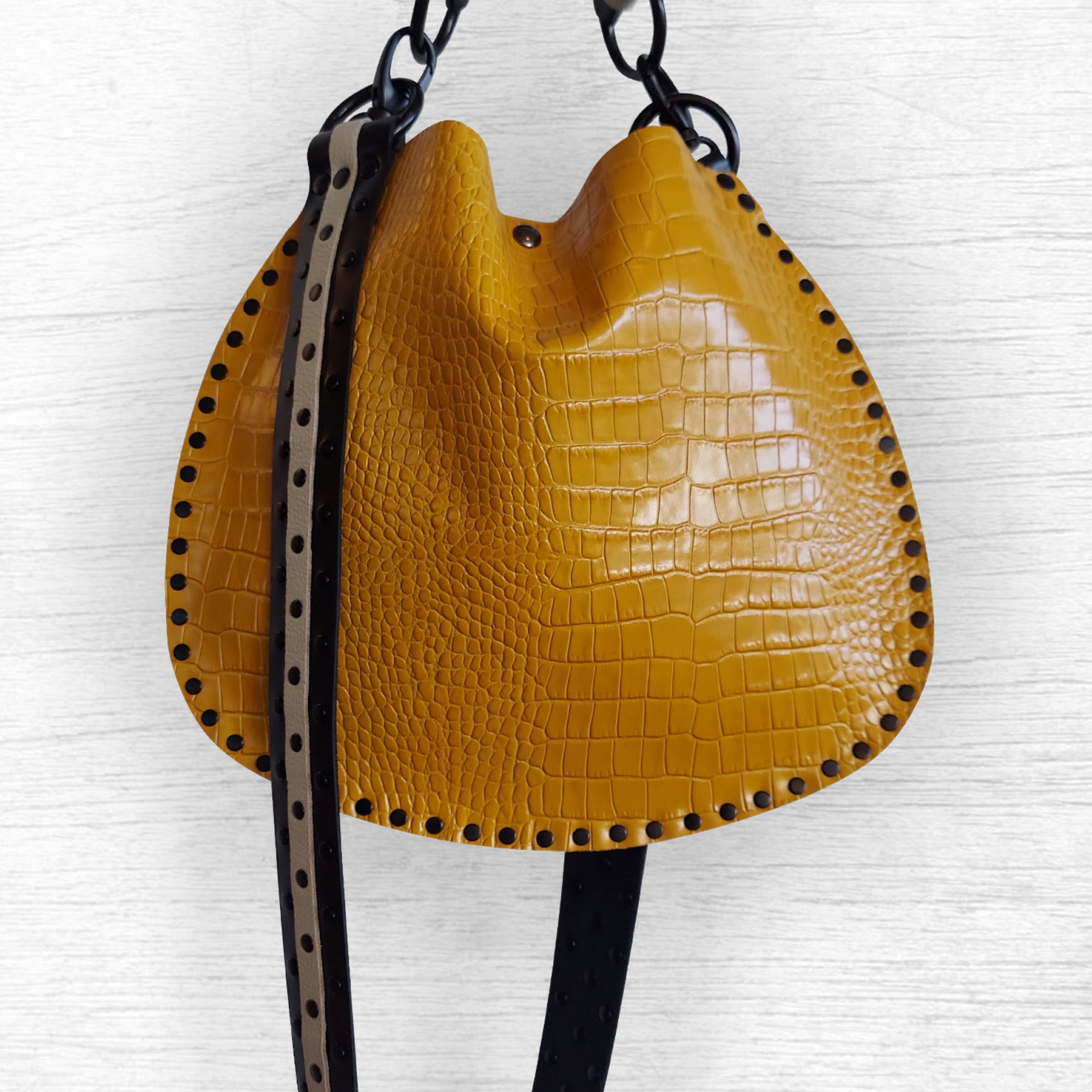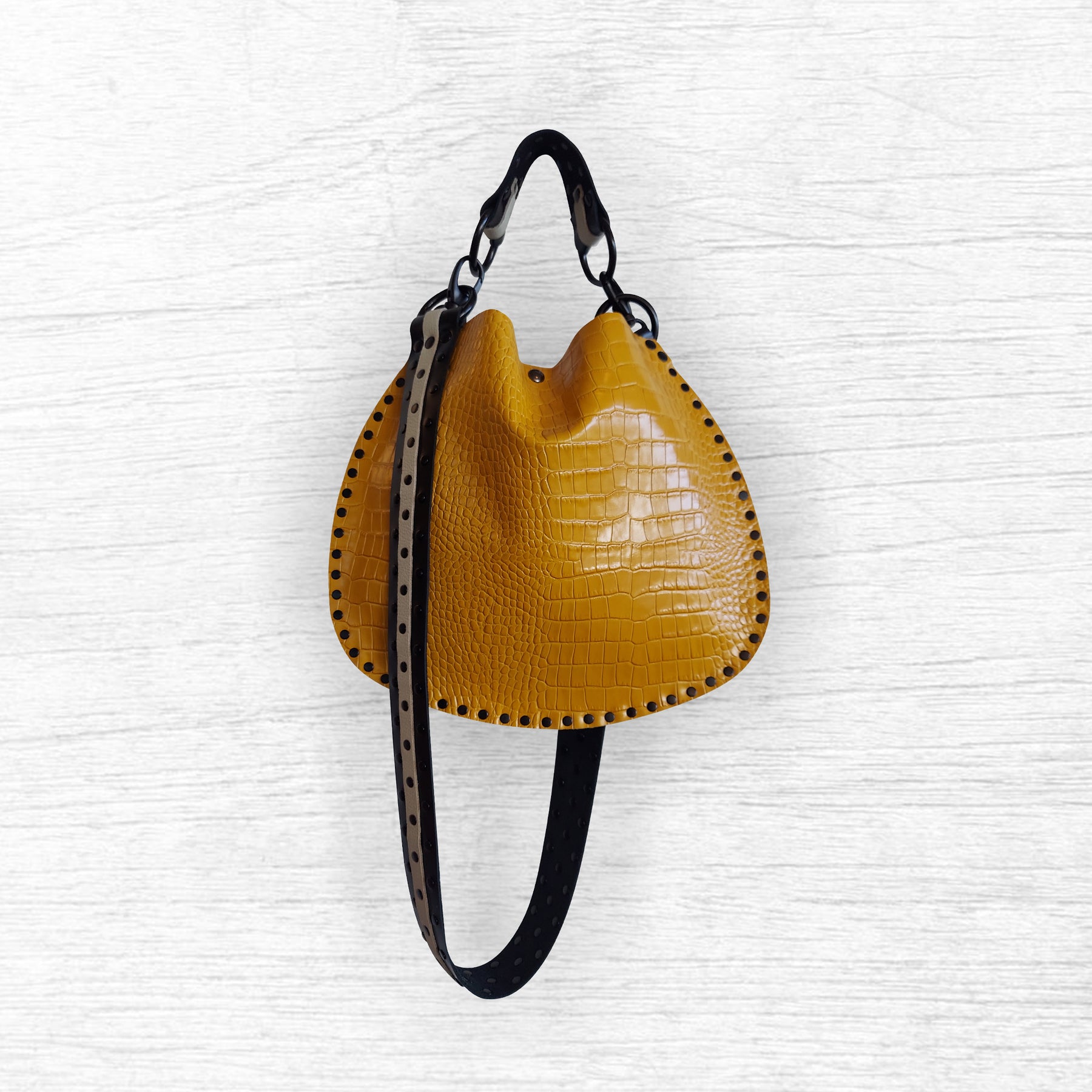 This Medium Crossbody comes in lemon croc print leather with signature studded trio straps. The perfect bag all year round. Straps are detachable and can be worn on other Rebellion Medium X-Body Bags for a Bag Makeover!