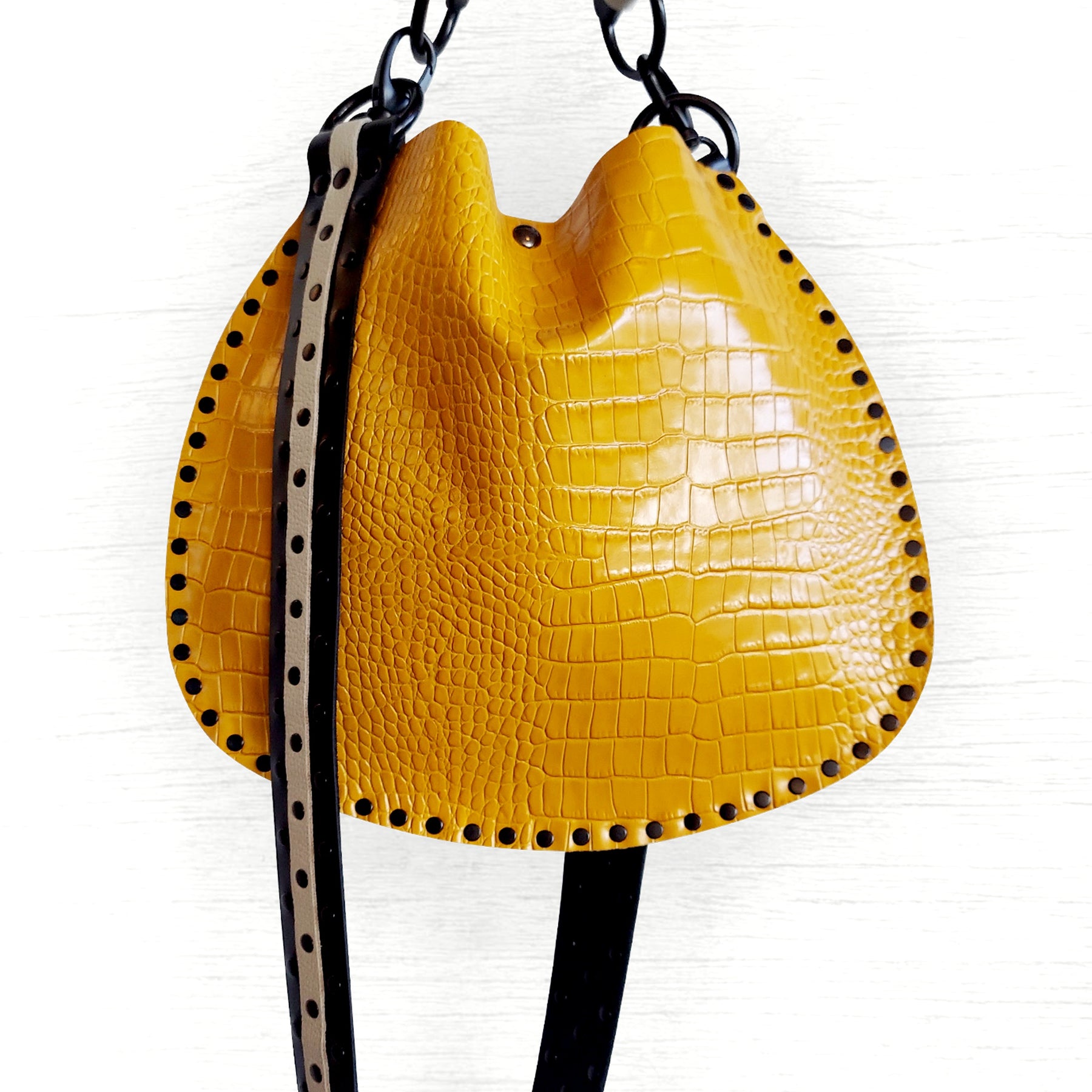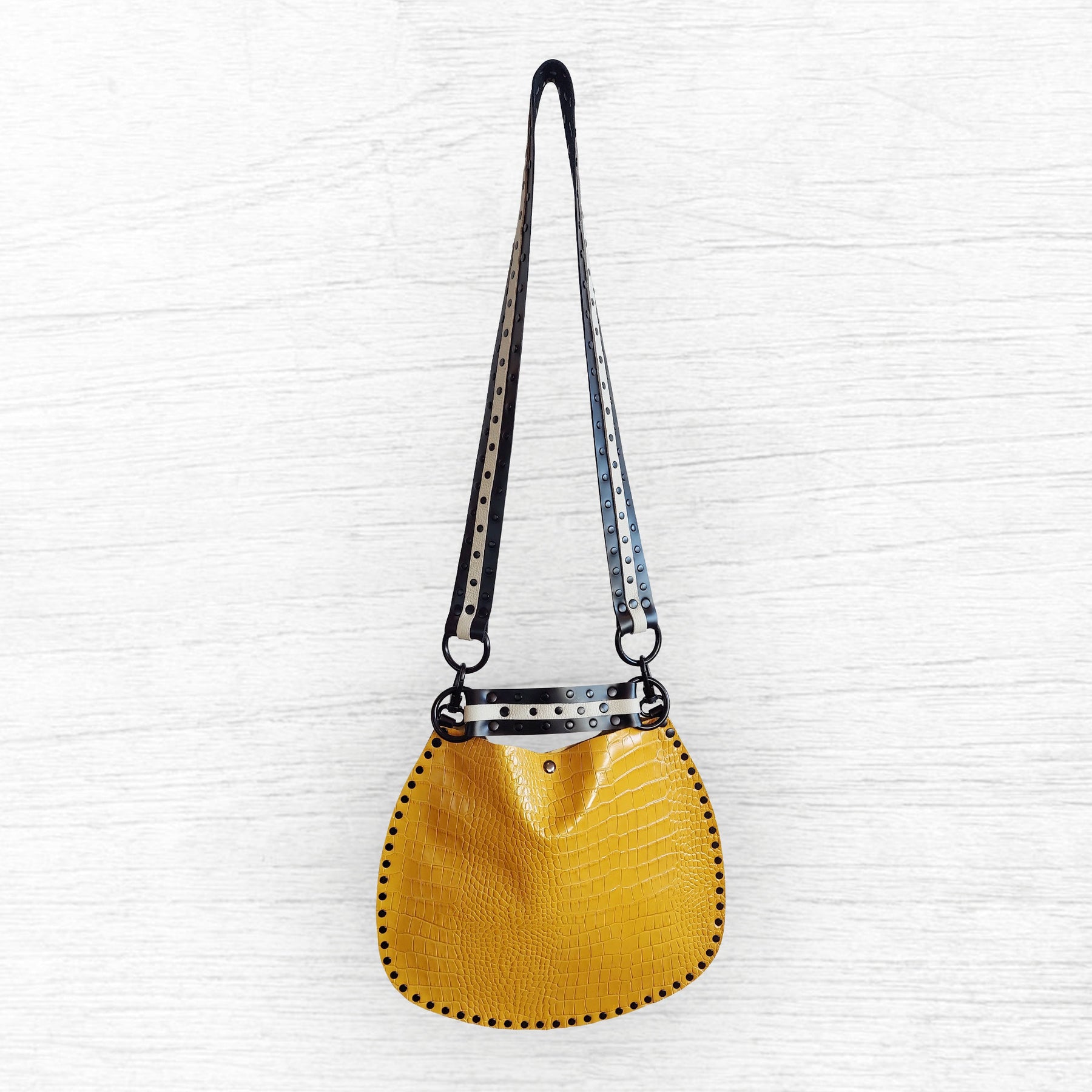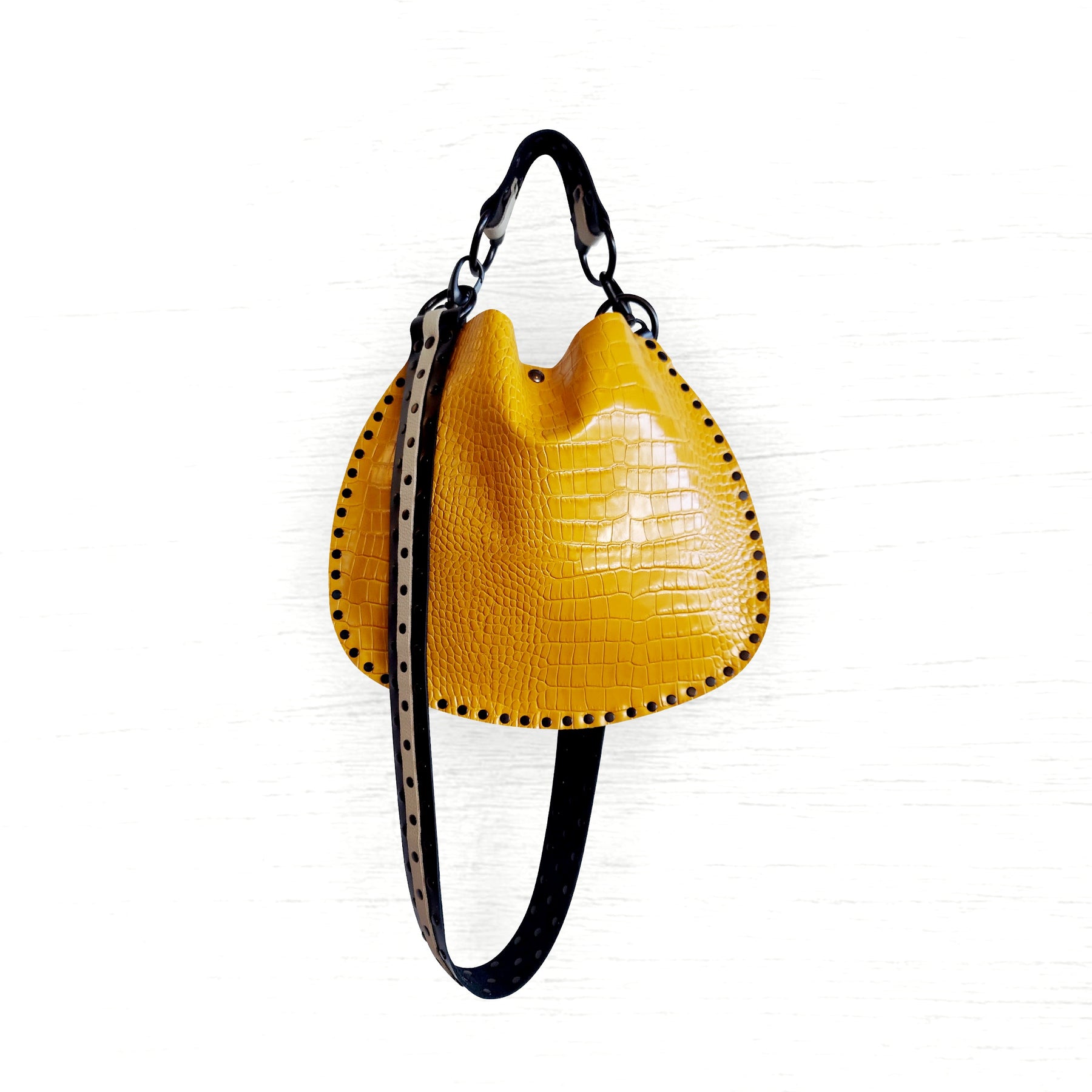 This Medium Crossbody comes in lemon croc print leather with signature studded trio straps. The perfect bag all year round. Straps are detachable and can be worn on other Rebellion Medium X-Body Bags for a Bag Makeover!